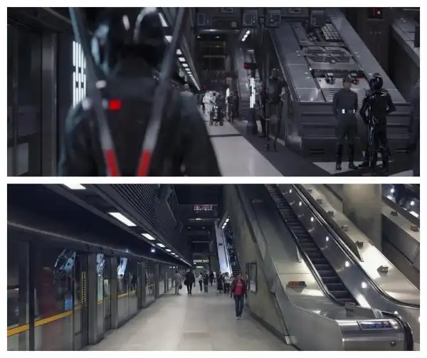 Интерьер космической станции был снят в общественном месте. В частности мы видим обычный эскалатор