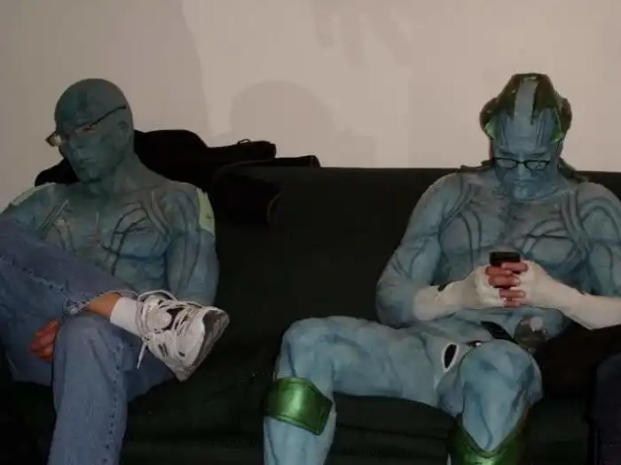Зои Салдана и её дублёрши примеряют маски Гаморы из «Стражей Галактики»