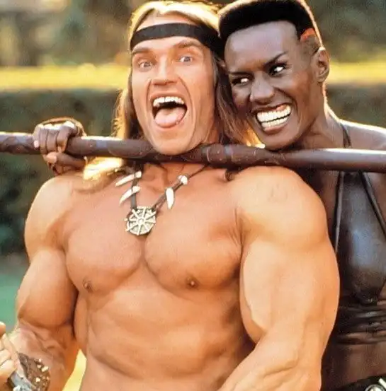 Актёры «Конана-разрушителя» Арнольд Шварценеггер и Грейс Джонс дурачатся
