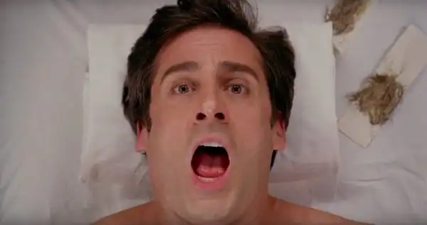 Во время сцены удаления волос на груди главного героя, актёру Стиву Кареллу на самом деле удаляли волосы на груди. Все его эмоции были неподдельными, реплики — непрописанными в сценарии, а сама сцена, соответственно, была снята в один дубль.