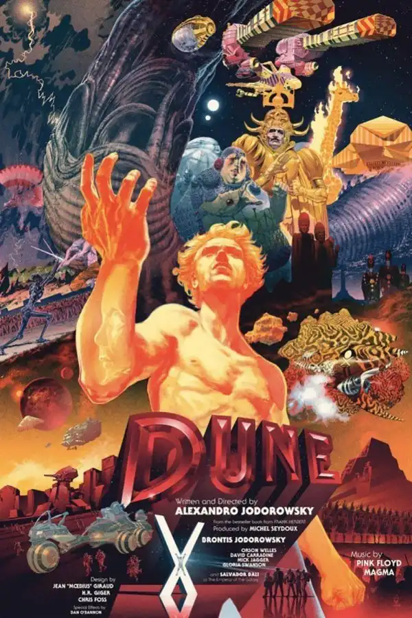 Отменённый фильм Алехандро Ходоровски, который пригласил на работу над проектом Орсона Уэллса, Сальвадора Дали, Ханса Рудольфа Гигера и группу Pink Floyd. Многие называют эту незаконченную экранизацию величайшим неснятым фильмом всех времён, и состав участников как и первоисточник правда впечатляют. В 2013 году о попытках Ходоровски создать этот фильм даже сняли документалку ««Дюна» Ходоровского».