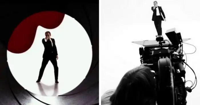 5. Дэниел Крейг на съёмках вступительной сцены с видом из дула пистолета для фильма про Джеймса Бонда «Квант милосердия» (2008)