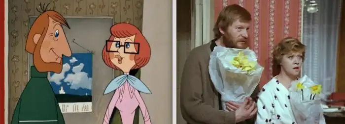 Конечно, мультфильм вышел в 1978 году, а фильм "Опасный возраст" (с Юозасом Будрайтисом в этом гриме) появился на три года позже, так что совпадение тут случайное. Может, его и вовсе нет, просто нам показалось... Как считаете, похожи эти папы или не похожи?