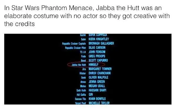В фильме "Звездные войны: Призрачная уроза" на роль Джабы Хатта не стали приглашать актера: его роль сыграл полый костюм. Поэтому создатели фильма смогли от души оттянуться в титрах