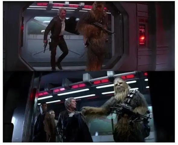 В "Пробуждении силы" (2015) Хан Соло, прибыв на базу "Старкиллер", бросает на пол куртку. При отлете Чубакка подбирает ее и отдает Хану, на лице которого читается удивление. Этого эпизода не было в сценарии: актер Йонас Суотамо сымпровизировал