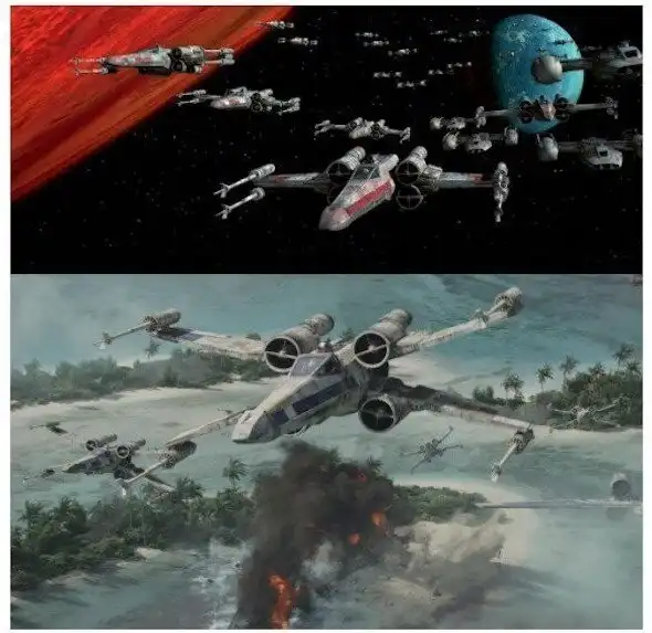 В "Новой надежде" атаковать Звезду смерти должны были красное и синее звенья, но синее звено терячлось на синем съемочном фоне - поэтому его пришлось заменить на золотое