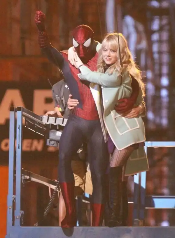 Эндрю Гарфилд и Эмма Стоун ждут команды «Мотор!» на съемочной площадке супергеройского фильма «Новый Человек-паук. Высокое напряжение»