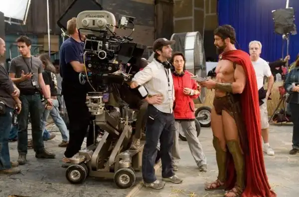 Режиссер Зак Снайдер и актер Джерард Батлер обсуждают сцену на площадке фильма «300 спартанцев»