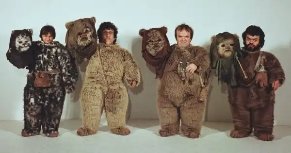 Эвоки из «Звёздных войн» на самом деле не милые мишутки, а люди. Фото со съёмок фильма «Звёздные войны. Эпизод VI: Возвращение джедая» (1983).