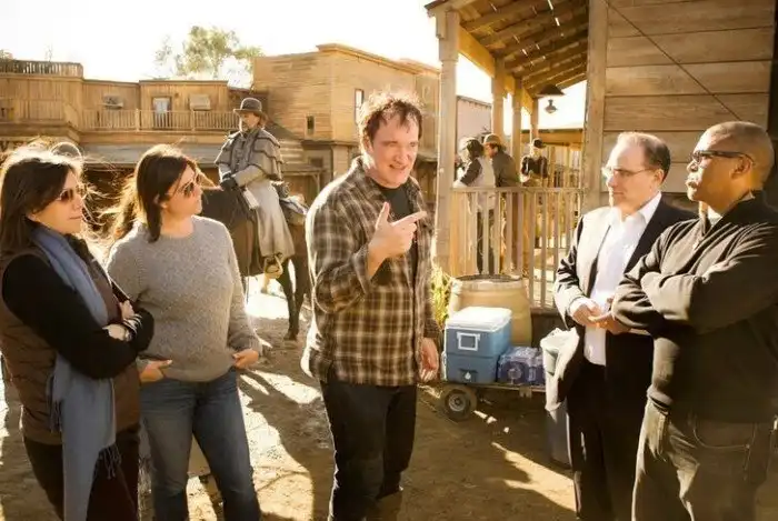 11. Квентин Тарантино и Кристоф Вальц (на заднем фоне) на съемках «Джанго освобожденный»