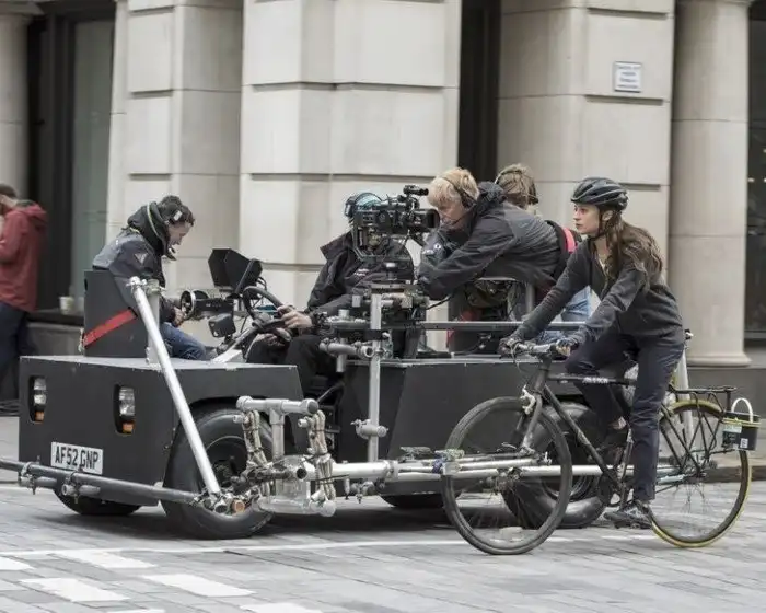 35. Ребекка Фергюсон на мотоцикле, который закреплен на движущейся платформе, во время съемок боевика «Миссия невыполнима: Племя изгоев»