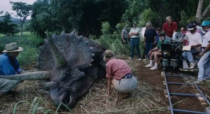 37. Лора Дерн, Сэм Нилл и Стивен Спилберг на съемочной площадке блокбастера «Парк юрского периода»
