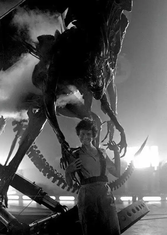43. Сигурни Уивер смотрит в камеру в перерыве между съемками фильма «Чужие» 1985 год