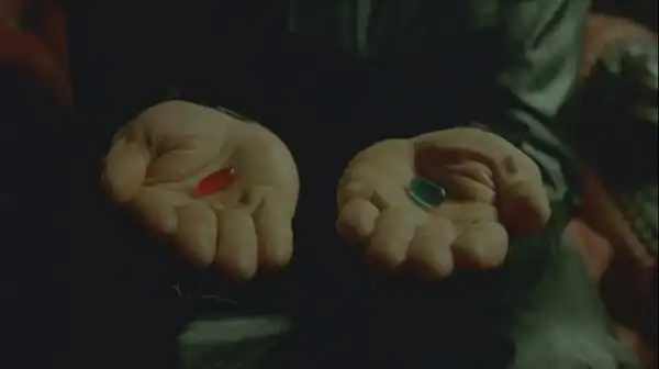 В фильме главному герою предлагают сделать выбор: принять синюю таблетку и забыть о страшной правде, которую он узнал. Или принять красную таблетку и остаться жить в жестокой реальности.