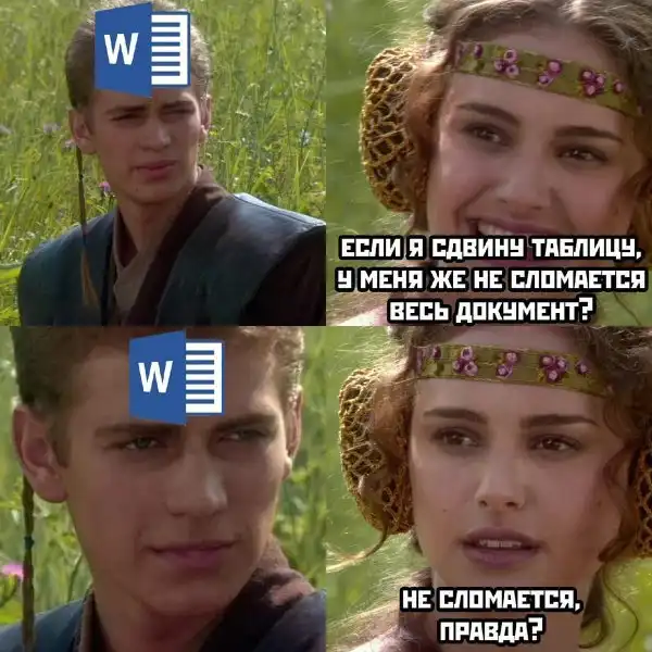 В качестве шаблона мемоделы взяли момент, когда Энакин и Падме устраивают совместный пикник. В мемах Падме неправильно понимает Энакина, что и веселит зрителей.