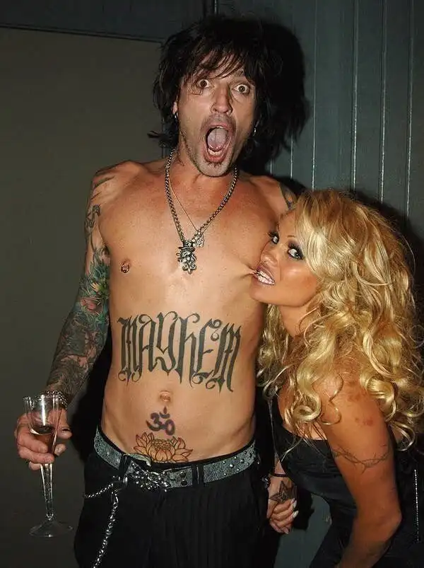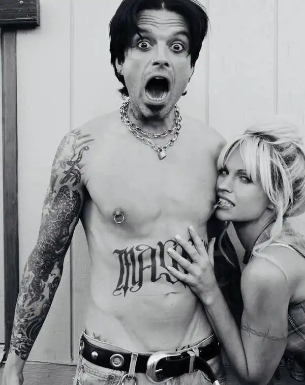 7. Томми Ли и Памела Андерсон, и актеры Себастиан Стэн и Лили Джеймс с фильме "Пэм и Томми" (2022)