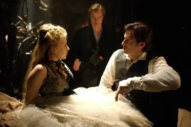 Скарлетт Йоханссон, Кристофер Нолан и Хью Джекман на съемках фильма «Престиж» (2006)