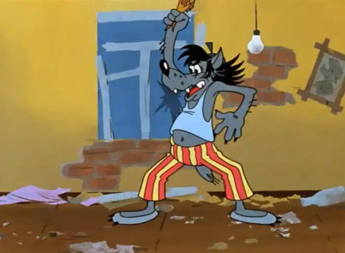 В этот раз я хочу обратить ваше внимание на эпизод с той самой рыбой, которую Волк всё никак не мог раскусить, из-за чего разгромил весь дом, включая стол. Так, стоп. А где же стол на втором кадре?