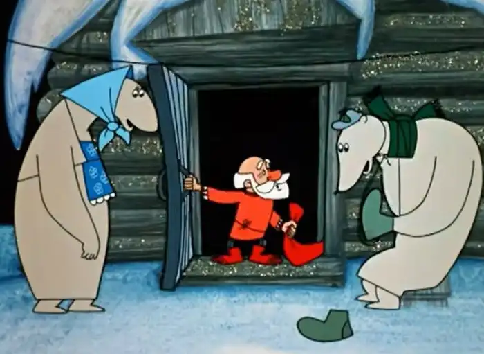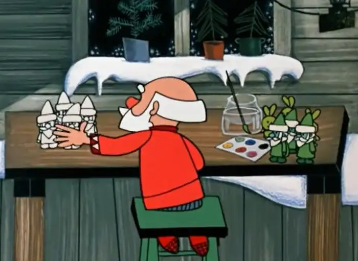 В этом чудесном мультфильме я также заметил деталь, которую мультипликаторы попросту упустили. Деталь эта заключается в краске, которую Дед Мороз наносил на игрушки.
