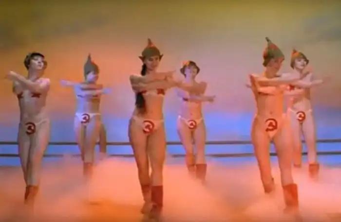 Кстати. В этом же последнем гайдаевском фильме есть и момент "Краснознаменного" стриптиза советских девушек перед иностранными гостями. Говорят, одна из девиц танцует никому тогда еще неизвестная молодая Нонна Гришаева. Но опознать довольно сложно.