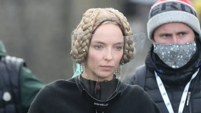 Джоди Комер в специальной защитной маске на съёмках фильма «Последняя дуэль» (2021)