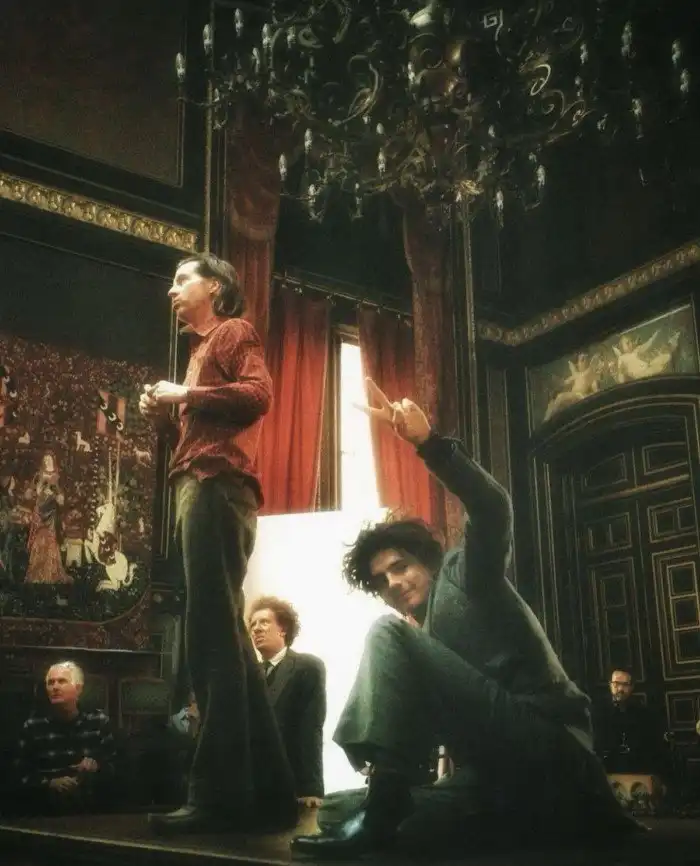 Уэс Андерсон и Тимоти Шаламе на съёмках фильма «Французский вестник» (2021)