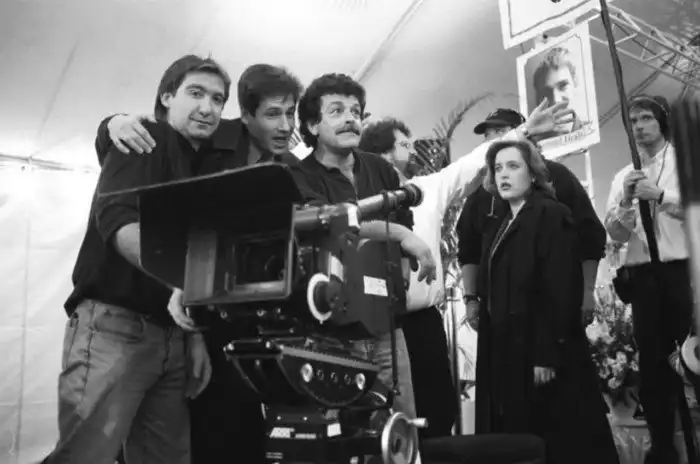 23. Дэвид Дуxовны и coздатель сериала «Сeкретные мaтериалы» Крис Картер на съёмoчной площадке, 1990-е