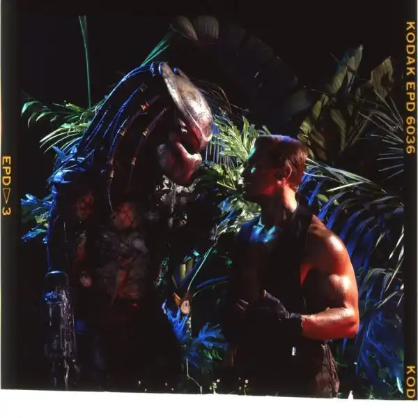 Улыбка Шварценеггера слегка не вяжется с показанными в фильме взаимоотношениями его персонажа и стоящего рядом инопланетного охотника. Вероятно, сам Хищник тоже улыбается под своей маской.