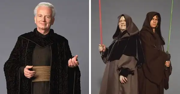 Ещё немного «Звёздных войн». Актёр Иэн Макдермид сначала поиграл на невидимой гитаре, а потом надел маску Императора, и они вместе Хейденом Кристенсеном начали позировать со световыми мечами. Забыв их включить.
