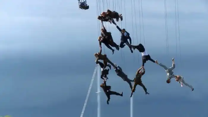 Но были сложные сцены и без помощи специальных эффектов. Солдатов, которые спрыгнули с самолета и полетели на вингсьютов, на самом деле сыграли каскадеры. Конечном взрывы вокруг пришлось нарисовать, но этот впечатляющий прыжок был тяжелой работой специально обученных людей. Примечательно, что в этой сцене были кадры от первого лица, потому что на шлемах каскадеров были экшн-камеры, которые снимали весь их прыжок.