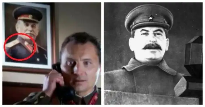 Тут уже “досталось” товарищу Сталину. Действие фильма происходит в 1941 году: в одном из эпизодов, комиссар обороны СССР Лев Мехлис, разговаривает по телефону на фоне портрета вождя, и Сталин на нём в кителе и погонах. Видимо, получил их досрочно.