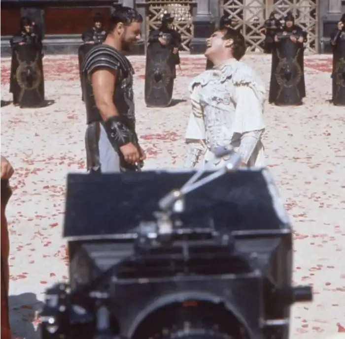 8. Враги на экране, друзья за пределами: Рассел Кроу и Хоакин Феникс смеются на съемках «Гладиатора»