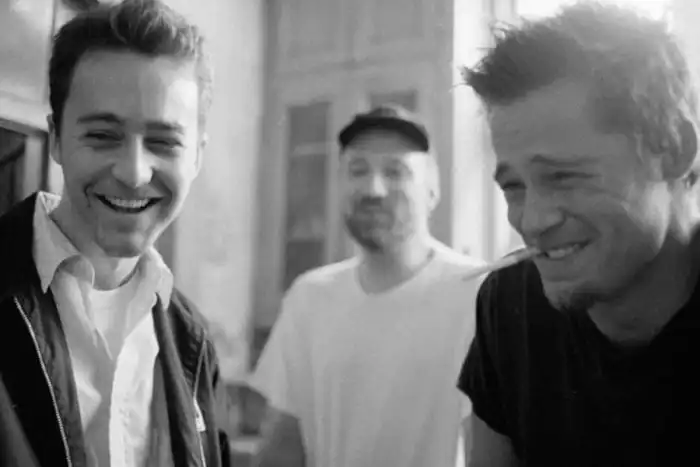 11. Эдвард Нортон, Дэвид Финчер и Брэд Питт на съемках «Бойцовского клуба»