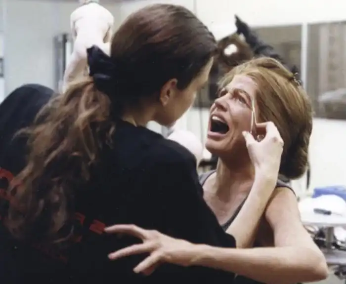 15. Линде Хэмилтон поправляют грим на съемках «Терминатора 2»