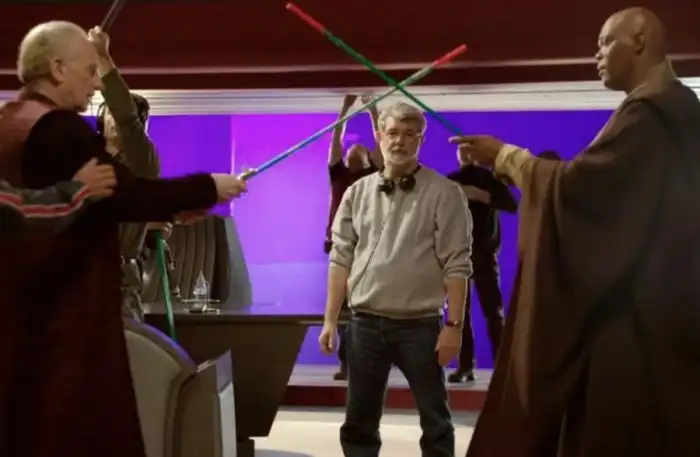 26. Джордж Лукас руководит постановкой боя на съемках «Мести ситхов»