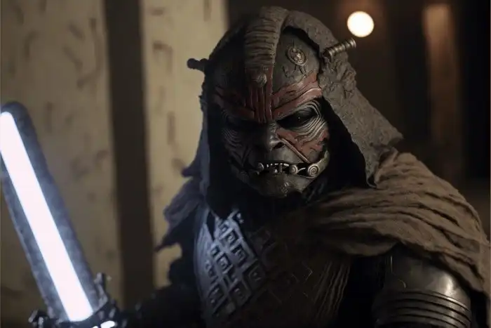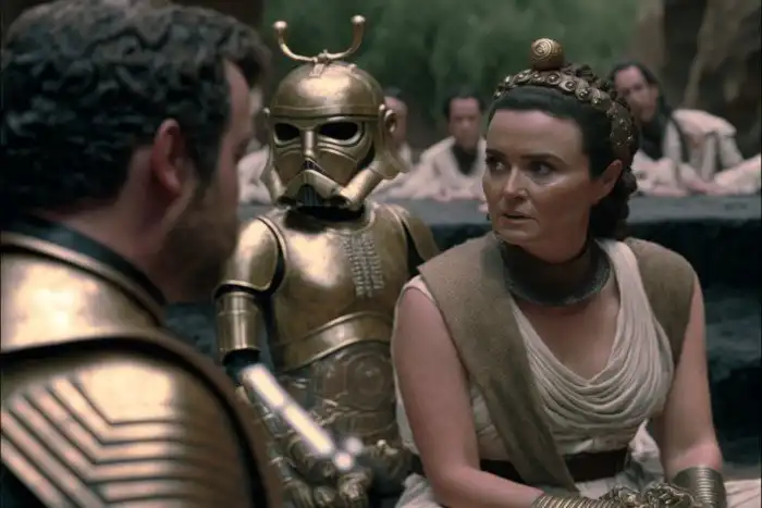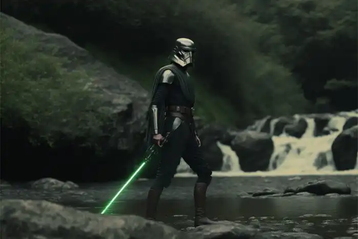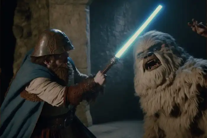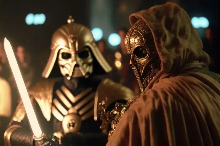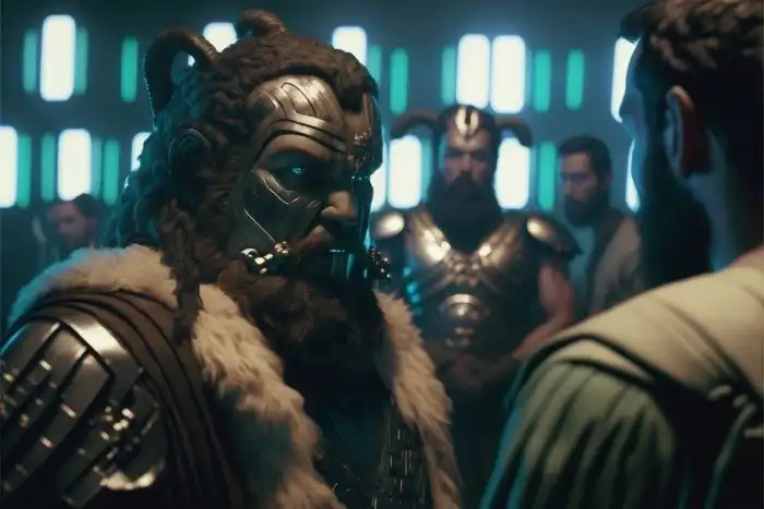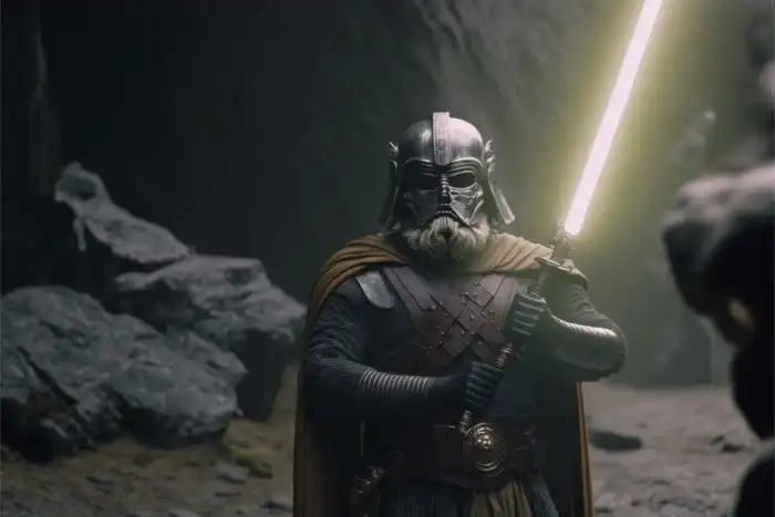 Новая альтернативная вселенная от нейросети Midjourney демонстрирует, как бы выглядели «Звёздные войны» в стилистике кельтской мифологии. Сочетание световых мечей и рогатых шлемов получилось более чем оригинальным. Судите сами.