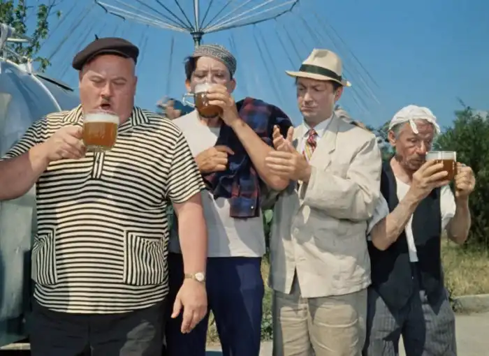5. В кадре с пивом в "Кавказской пленнице" Георгий Вицин пьет настойку шиповника вместо пива. Это заметно по отсутствию характерной пены.