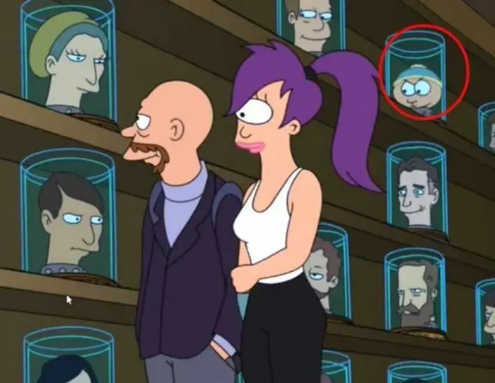 В мультсериале “Футурама” в одной из серий показали забавный момент. В одной из колб, расставленных на полке, была найдена голова популярного персонажа из мультфильма “Южный парк” Эрика Картмана.