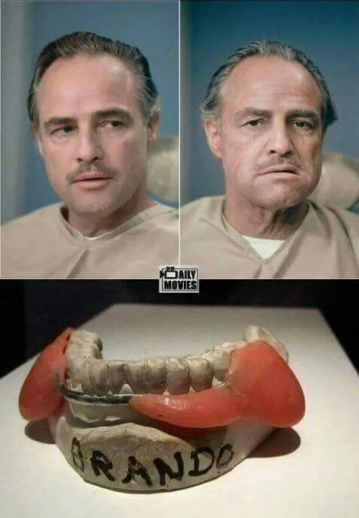 11. В "Крестном отце" 1972 года, Марлон Брандо хотел, чтобы Вито Корлеоне выглядел как бульдог, поэтому во время репетиции он набивал щеки ватой, но в самом фильме он надевал специальные протезы