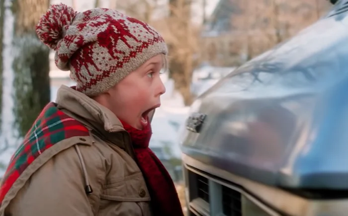 Сцена, когда машина Гарри и Марва чуть не сбивает Кевина, останавливаясь в сантиметре от него, выглядит немного жутковато. Ведь если что-то неточно рассчитать, то пацана бы могли сбить. Но не в этом случае, так как сцену снимали наоборот. Кевин стоял вплотную к машине, а затем она отъезжала назад. После этого сцену пустили в обратном направлении.