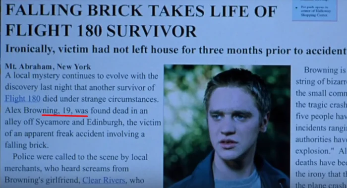 8. В фильме есть небольшая несостыковка. Со времен авиакатастрофы рейса 180 прошел ровно год. На тот момент Алексу Браунингу (главному герою первой части фильм "Пункт назначения") было 17 лет. Во второй части мы можем увидеть газетный заголовок, что Алекс погиб в возрасте 19 лет. Но такого быть не может, так как ему не могло быть больше 18. Подробнее о съемках первой части фильма "Пункт назначения" вы можете почитать в моей предыдущей статье.
