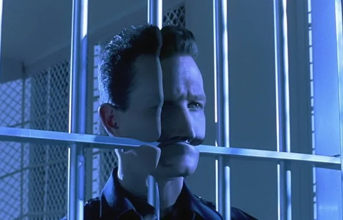 1. Сцена, когда Т-1000 проходит сквозь прутья. Для этого сняли коридор сначала с решетками, а потом и без них. Дальше наложили лицо Патрика и смоделировали эффект обтекания прутьев.