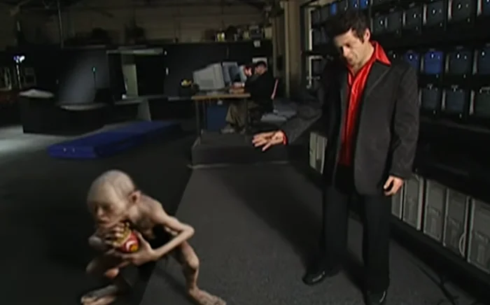 Ну а затем Энди Серкиса переодевали в костюм с датчиками и снимали с ним отдельные сцены, после чего на его движения "натягивали" Голума и вставляли его в сцены с живыми актерами.
