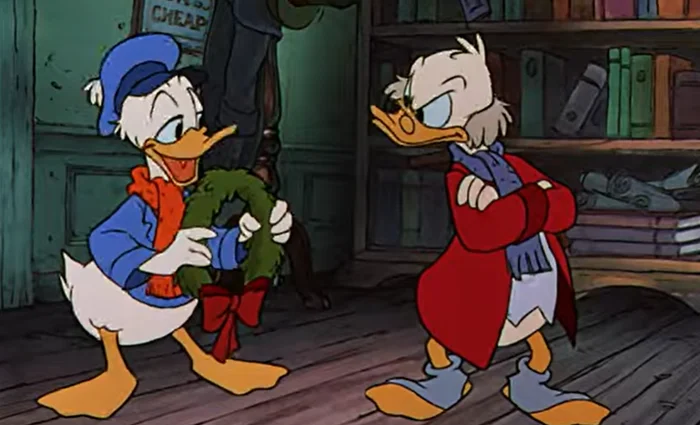 А в 1983 году вышел мультфильм "Рождественская песнь Микки", которая обыгрывает "Рождественскую песнь" Чарльза Диккенса. Здесь Скрудж выступает в роли скупердяя Эбенезера Скруджа, на котором он, собственно, и был основан.