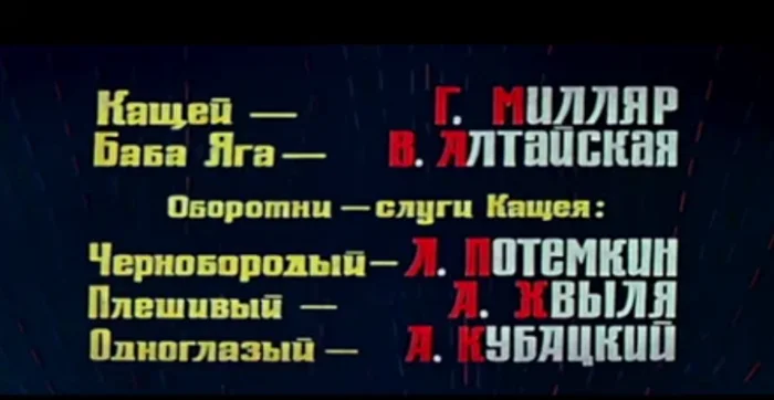 16. В титрах фильма "Огонь, вода и медные трубы" ошибочно указано, что Бабу Ягу играет Вера Алтайская - Бабу Ягу играет Георгий Милляр. Алтайская играла дочь Бабы Яги. Вообще, в фильме "Огонь, вода и медные трубы" Георгий Милляр играет сразу три роли - Бабу Ягу, Кощея Бессмертного и глухого пожарного.