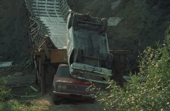 20. В сцене, когда "Москвич" приземляется на "Жигули", у "Москвича" был извлечен двигатели и другие детали, чтобы облегчить машину. Внутри же "Москвича" в тот момент сидели не актеры, а три манекена.