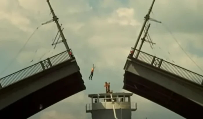 Но после всех расчетов отказалось, что расстояние от края моста до теплохода составляло около 8 метров. Естественно, прыгать с 8 метров было нельзя. Тогда создатели фильма пошли на маленькую хитрость. На теплоходе была сделана небольшая надстройка, благодаря чему расстояние сократилось до 5 метров, что все равно было опасно для прыжка.