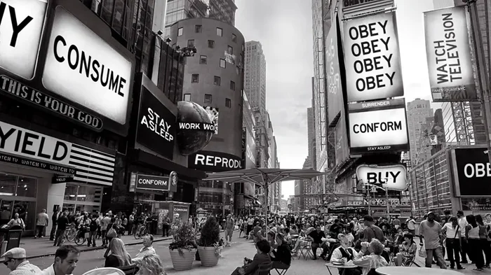 Помимо скрытых сигналов поступающих в мозг через телеэфир, в картине уделяют большое внимание пропаганде потребления. Надев очки Джон видит реальный смысл всех вещей. Мир в них предстает черно-белым и даже серым. На обложках журналов и рекламных плакатах красуются надписи настоящих посланий рекламы — покупай, женись, размножайся, не спорь с властью, подчиняйся и т.д.