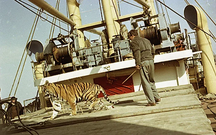 Все эти два месяца Константиновский, Назарова и их помощники натаскивали тигров на старом пароходе "Матрос Железняк", который стоял в Ленинграде, чтобы полосатые котики привыкли к съемкам на корабле.