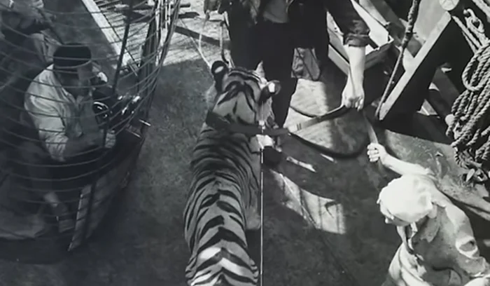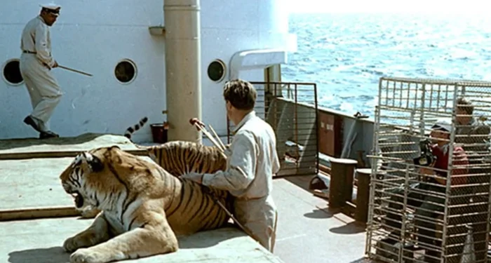 А вот сцену, когда тигры приплывают обратно на корабль, снимали уже не на Черном море, а в бассейне на студии "Ленфильм".